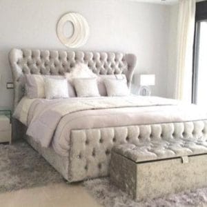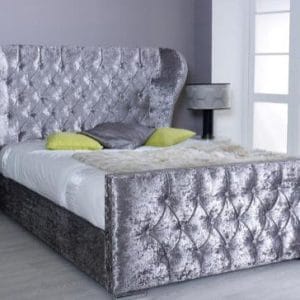 Safina Wing Back Bed in Grey Plush Velvet – Buttons