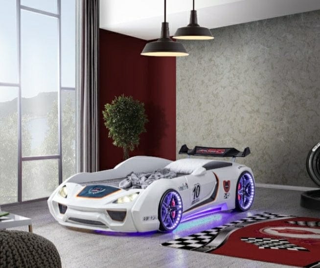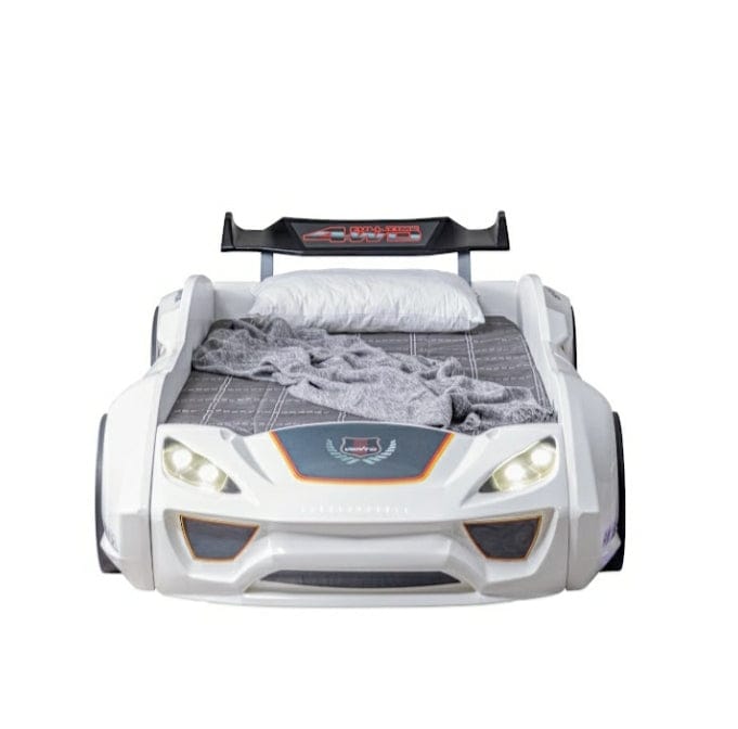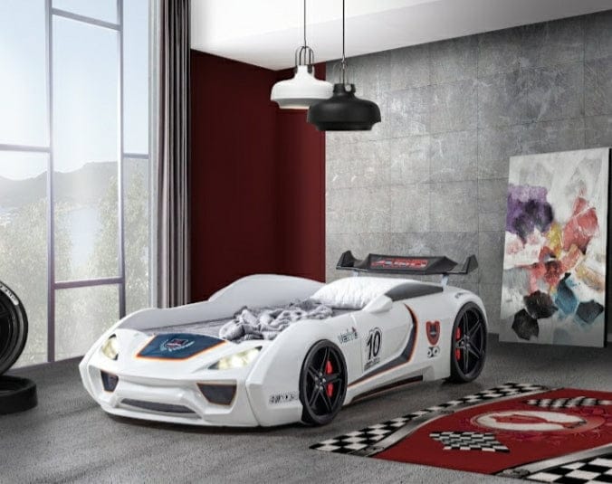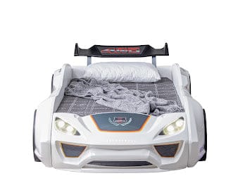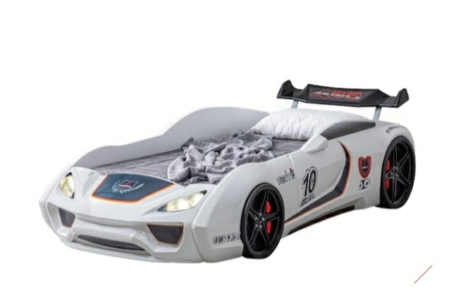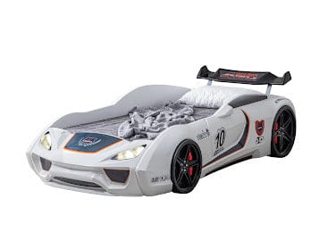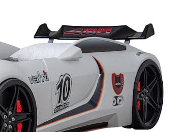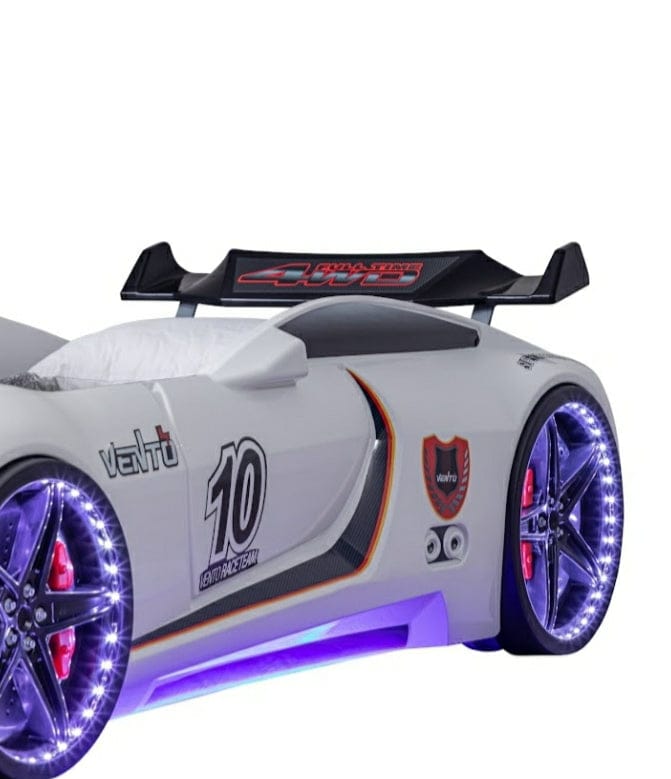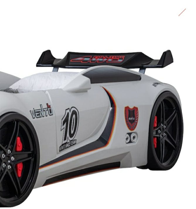 The Vento car bed in White is bold statement for the more daring racer. This car is hot with a grill nestled into the front spoiler and two side scoops. The bulging wings command attention. This model includes a rear spoiler.