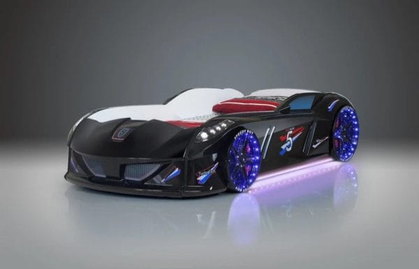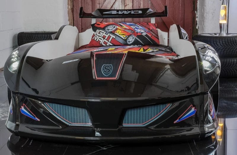 The Thunder Race car bed in black is bold statement for the more daring racer. This car is hot with a grill nestled into the front spoiler and two side scoops. The bulging wings command attention. This model includes a rear spoiler.