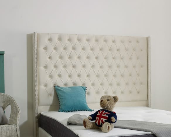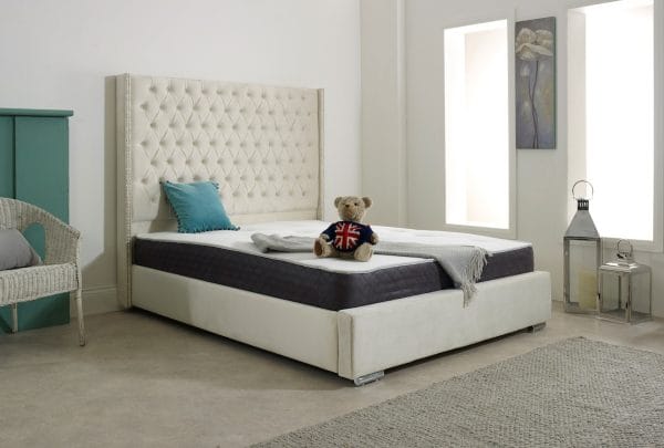 Winged Majesty: The Jessie Bed Frame boasts a headboard upholstered with chesterfield style, offering optional diamanté or matching fabric to infuse your personal touch. The wings in the headboard are a visual feast, thick and adding depth, adorned with a double stripe of beading on the front for an extra layer of grandeur.