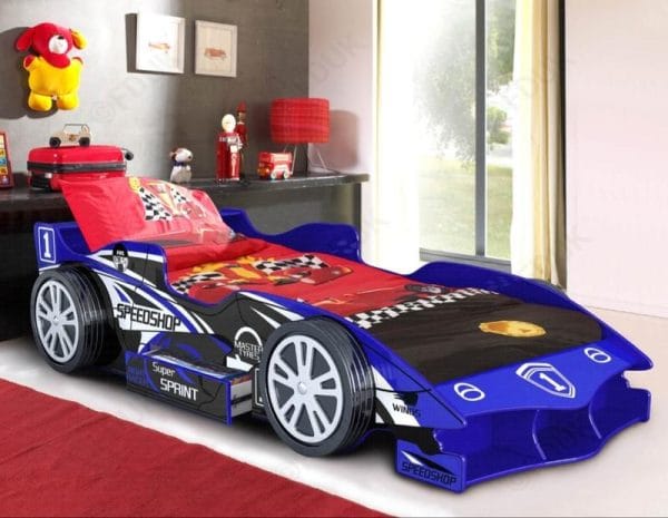 The F1 blue racing car bed for kids frame is perfect for any young speed racer.