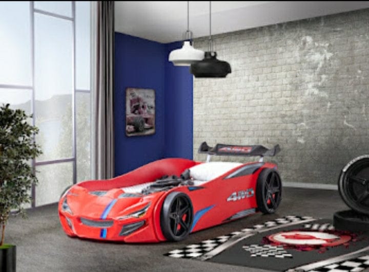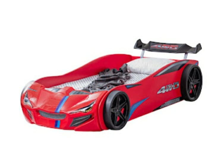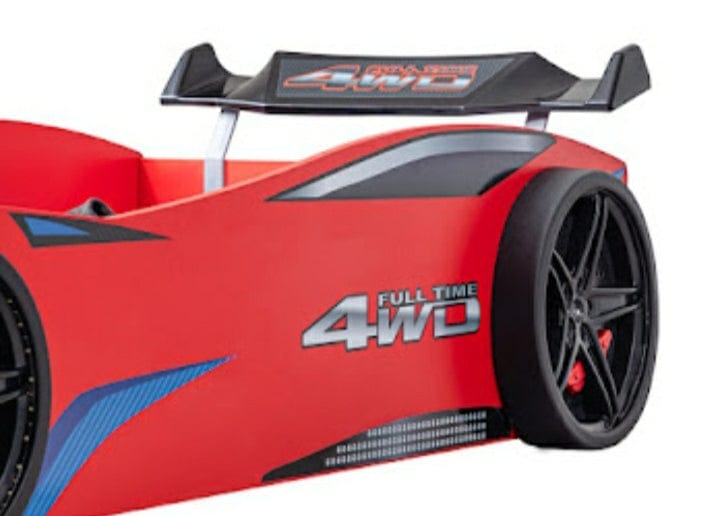 The GT race car bed in red is bold statement for the more daring racer. This car is hot with a grill nestled into the front spoiler and two side scoops. The bulging wings command attention. This model includes a rear spoiler.