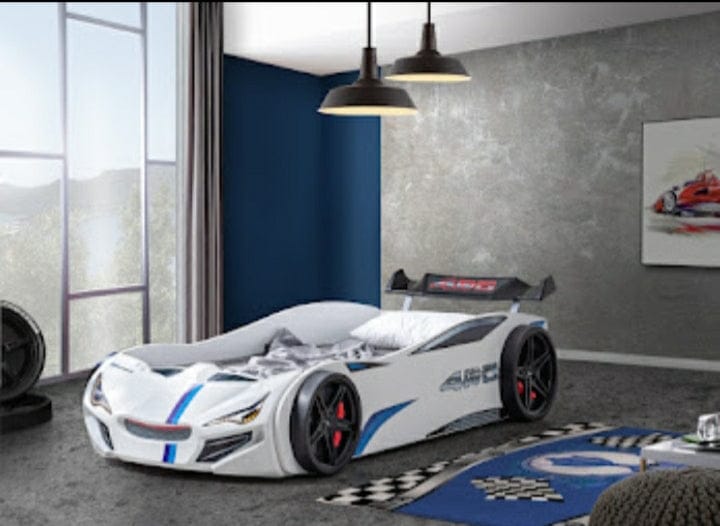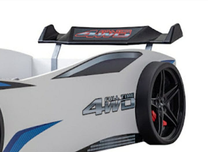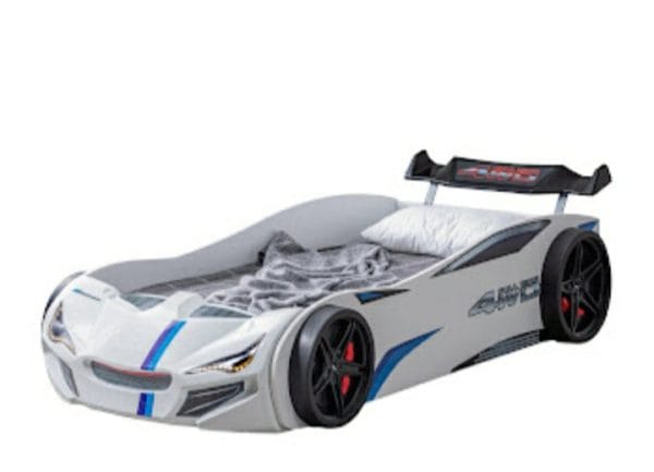 The GT race car beds in white is bold statement for the more daring racer. This car is hot with a grill nestled into the front spoiler and two side scoops. The bulging wings command attention. This model includes a rear spoiler.