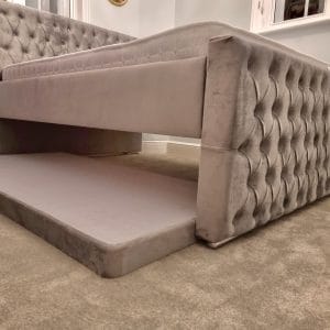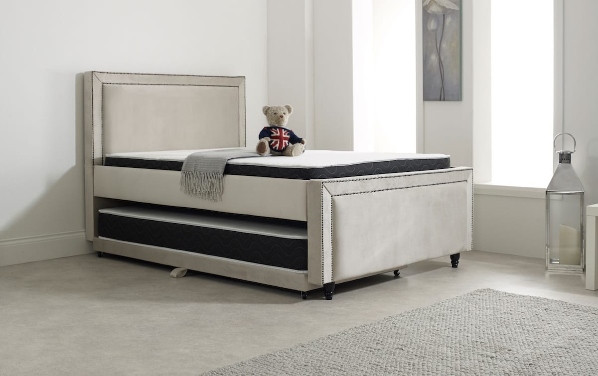Effortless Elegance: Introducing the Kerry Space Saver Trundle Guest Bed Frame – a harmonious blend of simplicity and sophistication. Handcrafted in our UK-based factory, this bed is upholstered on the headboard and footboard in a simple yet elegant design, with black beading forming a captivating frame. The beading serves as the focal point, adding a touch of understated glamour to any bedroom.