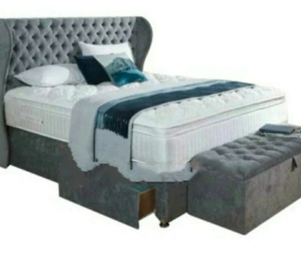 This luxurious platform top Divan Bed is constructed from the highest quality British timber right here in Great Britain. It is presented here in a stylish and contemporary material, designed to be the perfect addition to your bedroom available in various colours and fabrics. The winged deep buttoned chesterfield inspired headboard. Due to the versatile design of the headboard it can be attached to the Divan bases or used as a floor standing headboard.