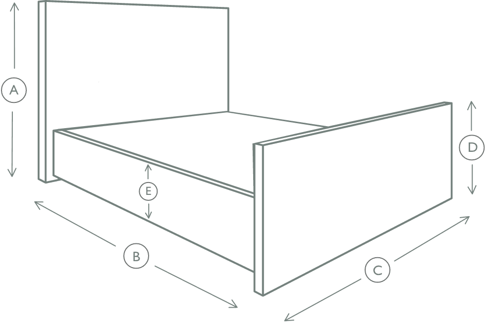 | A (Headboard Height) | B (Length) | C (Width) | D (Footboard height) | E (Side rail Height) | B (with Gas Lift storage length) | |