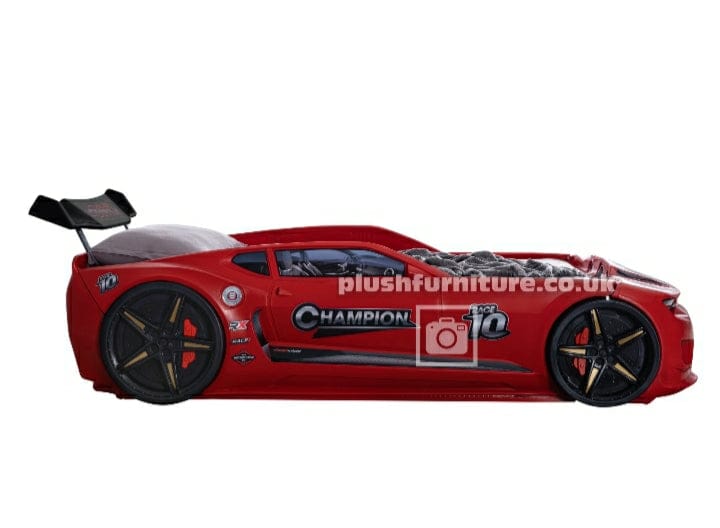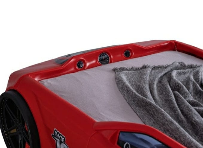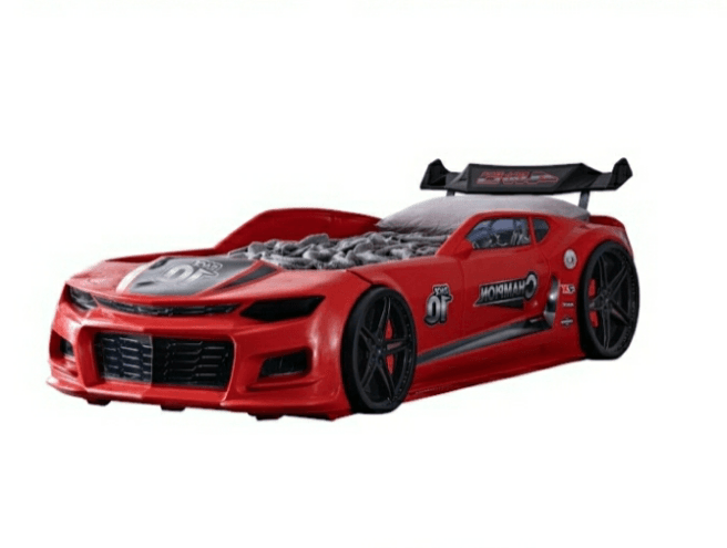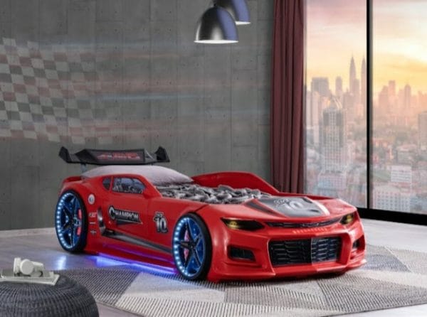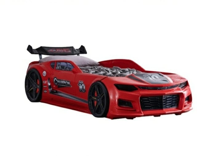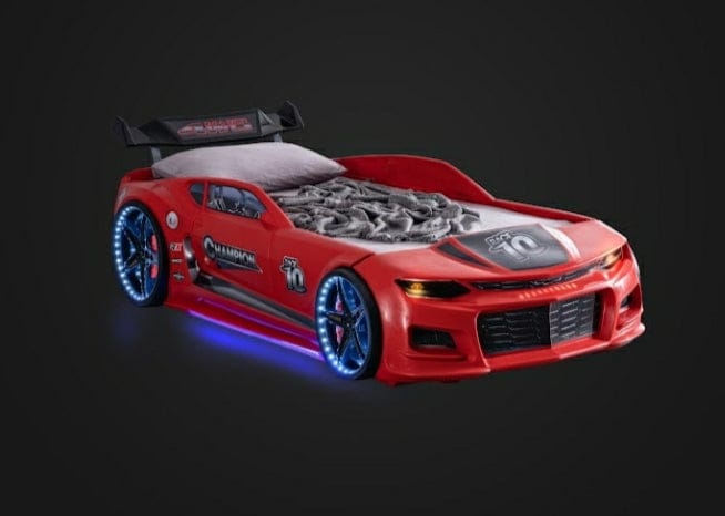 The Champion car bed in red is a bold statement for the more daring racer. This car is hot with a large grill nestled into the front bumper with LED lights built in. The bulging wings command attention. This model includes a rear spoiler.