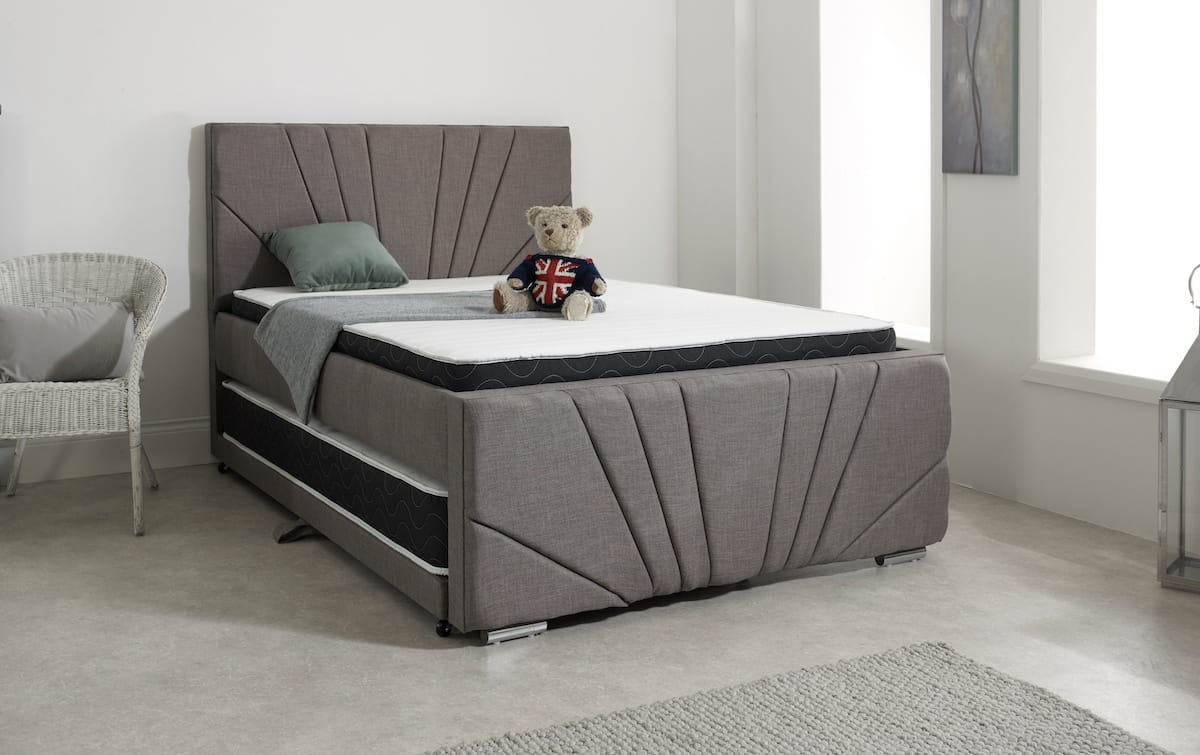 Radiant Design: Introducing the Sunbeam Linear Space Saver Trundle Guest Bed Frame – a captivating fusion of simplicity and elegance inspired by the rays of the sun. Handcrafted with precision in our UK-based factory, this bed features a headboard and footboard upholstered in a simple yet striking design, reminiscent of sunbeams creating panels at angles. Chrome feet add a modern touch, elevating the overall aesthetic.